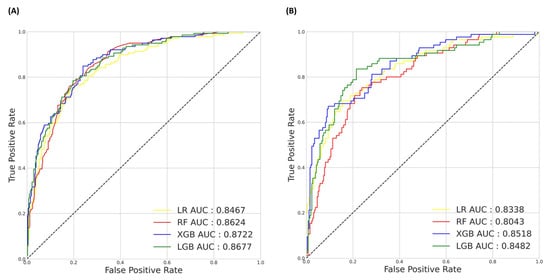 In the overall breast cancer group, XGB exhibited the highest discriminative ability, with an AUC of 0.8722, an F1 score of 0.6121, and an AUPRC of 0.7130, followed by LGB with an AUC of 0.8677, an F1 score of 0.6345, and an AUPRC of 0.7059, as shown in Figure 3A. XGB also had the highest accuracy of 0.8381 among the four ML models, followed by LGB with an accuracy of 0.8094 and RF with an accuracy of 0.8058.
