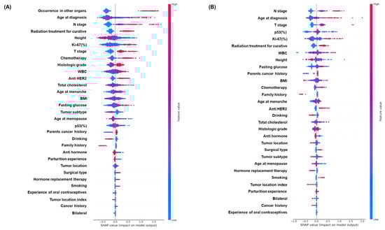 The SHAP summary plots of the XGB: (A) overall breast cancer group and (B) breast-cancer-only group. SHAP, Shapley additive explanations; XGB, extreme gradient boosting.