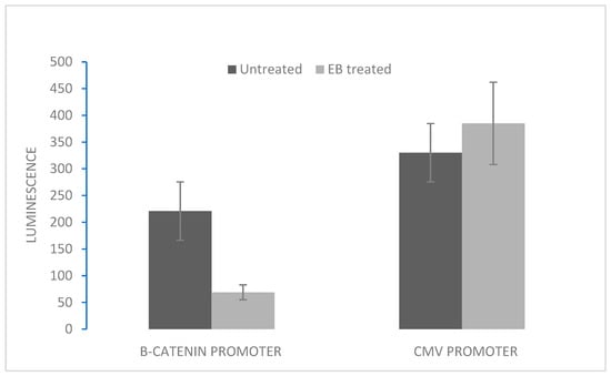 Effect of EB incubation on β-catenin promoter activity. H69 SCLC cells were transfected with DNA constructs containing either the β-catenin promoter coupled to firefly luciferase or the CMV promoter coupled to Renilla luciferase (control for transfection). After 24 h, transfected cells were incubated with either 2 µM EB or vehicle (DMSO) for 48 h. Luminescence was measured at 560 nM (firefly). After quenching, luminescence was measured at 480 nm (Renilla). Data are expressed as means ± SD of four experiments. For the β-catenin promoter, means between EB-treated and untreated conditions were statistically different (p < 0.05).