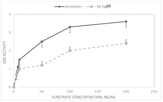 In vitro enzyme assays were performed to investigate possible direct inhibition of GSK3β by EB. The results (Table 4) showed that while EB did not inhibit purified GSK3β, EB did act as a non-competitive inhibitor of GSK3β activity in cell extracts (Figure 3). Thus, EB may act on the Wnt signaling pathway indirectly via GSK3β, possibly by inhibiting its inactivation via phosphorylation (see above, Table 2) [35].