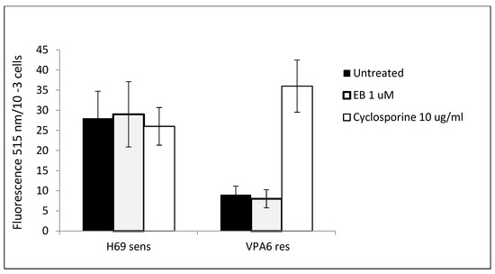 The Vybrant Multidrug Resistance Assay Kit (Sigma, St. Louis, MO, USA) was used to screen for reversal of MDR via drug efflux. The assay uses the fluorogenic dye calcein AM (calcein acetoxymethyl ester), an MDR1 substrate. Briefly, 8 mL cultures of 5 × 104 cells/mL H69 and VPA SCLC cells were collected by centrifugation and resuspended in 500 µL of AIM-V medium. In a microplate, 100 µL cells were incubated with 50 µM of either EB (2 µM) or cyclosporin A—a known PGP inhibitor (5 µg/mL) or PBS control. After 15 min at 37 °C, 50 µL of 1 µM calcein AM was added for a further 15 min at 37 °C. Microplates were centrifuged at 500× g for 10 min. The supernatants were removed, and cell pellets were suspended in 200 µL cold AIM-V medium. Calcein retention in cells was measured as fluorescence (absorption 494 nm and emission 517 nm).