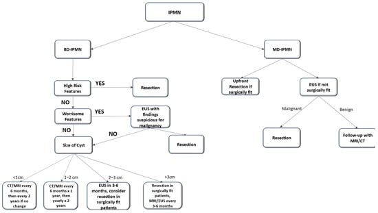In patients with a 5 to 9 mm MD-IPMN who do not undergo surgery, MRCP or CT scan within one year is recommended. If the duct is stable on repeat imaging, lengthening of the surveillance interval to every two years is recommended. In patients with a pancreatic duct < 5 mm, follow-up MRCP or CT in two years is recommended [103]. The optimal surveillance approach is unclear. For MRI, the American Gastroenterological Association suggests that the first round of surveillance should be within 1 year post diagnosis and then in 2-year intervals for cysts without size changes or development of worrisome characteristics [104]. On the other hand, the Sendai consensus guidelines suggest a more aggressive and variable surveillance strategy with intervals based on the size of the IPMN; In short, more aggressive-looking lesions should be followed by EUS versus CT for less aggressive ones, and the intervals shorten or become longer as necessary [98,105].