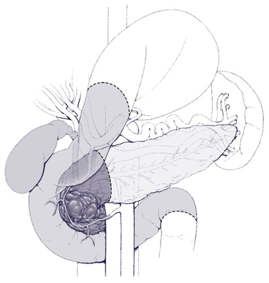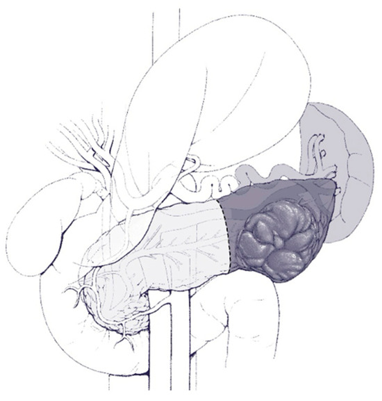 Different surgical procedures are indicated according to the location of the mass. In short, and as shown in Figure 3 and Figure 4, lesions on the head of the pancreas require the Whipple procedure, whereas lesions in the body/tail of the pancreas require distal pancreatectomy, and they can be performed via either open or minimally invasive means [107,108,109,110]. Less extensive resections, such as central pancreatectomy, can be performed, which consists of a parenchyma-sparing technique as shown in Figure 5.
