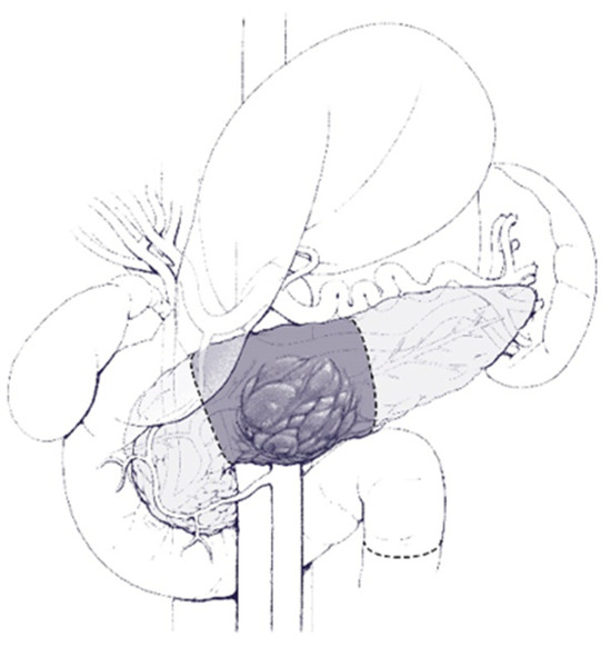 Illustration of the extent of resection during a typical central pancreatectomy.
