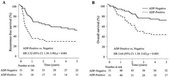 Kaplan–Meier survival curves revealed that patients in the ADP-negative group had better long-term survival compared with those in the ADP-positive group. Specifically, the 5-year RFS rate was 52.1% in the ADP-negative group and 29.4% in the ADP-positive group (p = 0.001; Figure 2A). The 5-year OS rate was 72.2% in the ADP-negative group and 43.7% in the ADP-positive group (p = 0.003; Figure 2B).