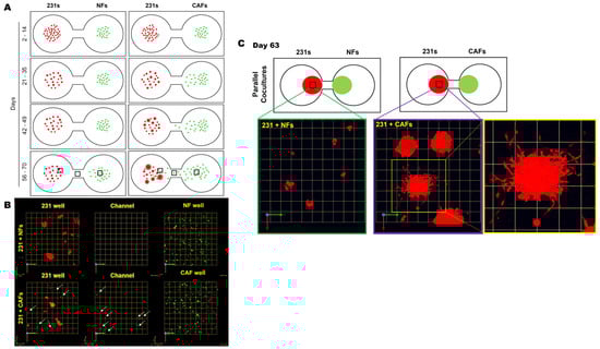 We next tracked the distribution and migration of each cell type within their respective wells, in monoculture and parallel cocultures. Schematics in Figure 2A illustrate the distribution, size, and acquisition of the invasive phenotype of 231 spheroids at indicated times in 3D parallel cocultures of 231 cells and NFs or CAFs. In 231 monocultures, spheroids formed within 7 days and did not show marked alteration in size, morphology, or migration from their seeding location over the culture period, as illustrated in Supplemental Figure S4. In parallel cocultures, we observed a significant migration of CAFs, but not NFs, toward 231 spheroids in neighboring wells (Figure 2A,B). A zoomed imaged of 231:CAF intermixed at day 63 shows the size and vast number of invasive outgrowths from the 231 spheroids in greater detail (Figure 2C). These results suggest that paracrine interactions between 231 cells and CAFs results in the increase in invasive phenotypes with spheroid size and the recruitment of CAFs to the cancer cell microenvironment. This is consistent with a previous report that 231 cells are a TNBC subtype that is characterized by stromal infiltration [23].