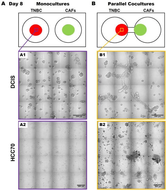 CAFs promote an invasive phenotype of MCF10.DCIS and HCC70 cells in 3D parallel cocultures. Schematics (top) and differential interference contrast (DIC) images of DCIS and HCC 70 cells in monocultures (A) and parallel cocultures (B) at day 8. Representative tiled DIC images of DCIS cells (A1) and HCC70 cells (A2) in monocultures. Tiled DIC images of DCIS cells (B1) and HCC70 cells (B2) in parallel cocultures with CAFs. Scale bars, 200 μm.