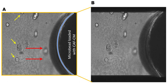 DCIS spheroids migrate towards CAF-CM. (A) Representative DIC images of the monoculture of DCIS spheroids (yellow arrows) near a CAF-CM-saturated microbead. Red arrows indicate the direction of migration. The location of the microbead is indicated by the blue line. (B) Video showing DCIS cells migrating towards a CAF-CM coated microbead over a period of ~20 h. Video available: https://zenodo.org/uploads/13924370 and also in the Supplementary Materials.