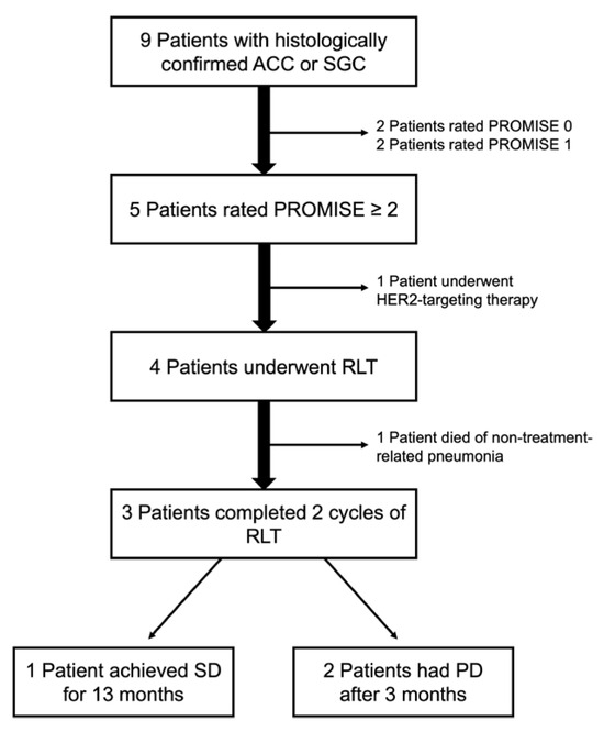 In this study, nine patients (seven females and two males) with ACCs or SGCs who underwent PSMA PET/CT were included. The initial diagnosis of the disease had already been made in these patients years ago. Therefore, all patients were heavily pretreated, and PSMA PET was performed for restaging and to evaluate the option of RLT. A flow diagram that outlines the study design and patient selection is provided in Figure 1.