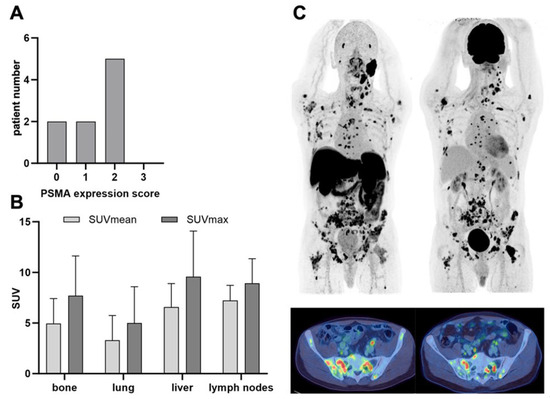 The PSMA expression score was evaluated for all patients: 0 (n = 2), 1 (n = 2), 2 (n = 5), 3 (n = 0) (Figure 2A). Six patients showed bone metastases with a mean SUVmax of 8.9 (standard deviation (SD) ± 3.1), six patients had lung metastases with a mean SUVmax of 5.7 (SD ± 4.0), two patients had liver metastases with a mean SUVmax of 9.6 (SD ± 4.5), and two patients showed lymph node metastases with a mean SUVmax of 8.9 (SD ± 2.4) (Figure 2B). Figure 2C displays an example of a patient with disseminated disease and intensive uptake of [18F]PSMA-1007 (PSMA score 2). This particular patient received an additional [18F]FDG PET/CT that revealed an intensive glucose metabolism of the respective tumor lesions.