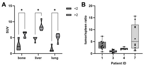 (A) Comparison of the SUVmean between tumoral PSMA expression scores of <2 and ≥2 in PET/CT, * p < 0.05. (B) Tumor/spleen ratio in the posttherapeutic [177Lu]Lu-PSMA-I&T SPECT/CT per lesion and patient.