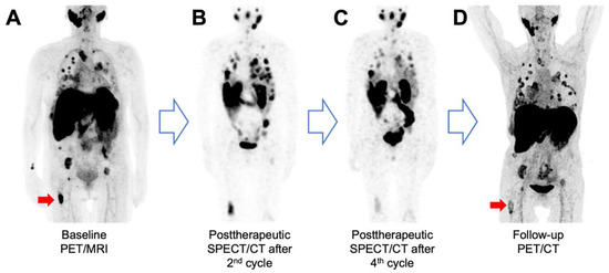 A 60-year-old female patient (ID 1) with an adenocarcinoma of the submandibular gland and a progressive disease under irinotecan combined with an ATR-inhibitor underwent a [18F]PSMA-1007 PET/MRI scan. (A) The MIP revealed increased PSMA expression in the disseminated lung and bone metastases (PSMA score 2). Posttherapeutic SPECT/CT after two (B) and four cycles (C) shows the intratherapeutic distribution of [177Lu]Lu-PSMA-I&T. (D) MIP from the posttherapeutic restaging PET/CT demonstrates a stable disease with decreasing PSMA expression in some metastases (red arrow).