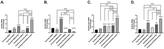 Three TNBC cell lines, MDA-MB-231, BT-549, and HS-578T, were studied to ensure that the results were not specific to a single cell line. We evaluated the relationship of IFN-α2 and AdvShSLFN12 in TNBC with carboplatin or paclitaxel. Following treatment, SLFN5, SLFN12-Like, and SLFN14 mRNA levels were measured via qPCR to evaluate the relationships among SLFN family members. In the MDA-MB-231 cells treated with carboplatin alone, SLFN12 and SLFN12-Like had increased mRNA expression (Figure 1B,C, second bars) while SLFN5 and SLFN14 had no changes in their mRNA levels (Figure 1A,D, second bars). When stimulated with IFN-α2, each SLFN family member examined significantly increased mRNA expression (Figure 1A–D, third bars). When SLFN12 was knocked out (AdvShSlfn12+DMSO), there were no changes in SLFN5, SLFN12-Like, or SLFN14 expression compared to Scramble + H2O control (Figure 1A,C,D, fourth bars). SLFN5, SLFN12-Like, and SLFN14 each had the largest increase in mRNA expression following the treatment combination of carboplatin, IFN-α2, and AdvShSLFN12 (Figure 1A,C,D, sixth bars). Similar results were demonstrated in both the BT549 and Hs-578T cell lines, which can be found in Supplemental Figures S3 and S5 (“*” or “†” = p < 0.05; “**” or “††” = p < 0.01; “***” or “†††” = p < 0.001; “****” or “††††” = p < 0.0001, same as below).