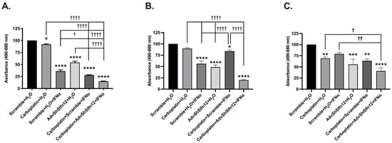 Carboplatin, IFN-α2, and the loss of SLFN12 effectively decreased TNBC cell viability. Crystal violet assay exhibited a decrease in cell viability following treatment with carboplatin, IFN-α2, or AdvShSLFN12, with the furthest decrease observed when all three treatments were combined in (A) MDA-MB-231 (n = 6, p < 0.0001), (B) BT-549 (n = 6, p < 0.0001), and (C) Hs-578T (n = 4, p = 0.0001). All error bars shown represent the standard error of the mean. Asterisks denote a significant difference between the control and each condition, and crosses indicate significant difference among the shown conditions. The p value is for both asterisks and crosses; asterisks denote a significant difference from the Scramble + H2O control, and crosses denote significant differences among the experimental groups.