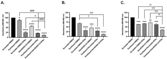 Paclitaxel, IFN-α2, and the loss of SLFN12 effectively decreased TNBC cell viability. Cell viability was measured with a crystal violet assay following treatment with paclitaxel, IFN-α2, or AdvShSLFN12, with the furthest decrease observed when all three treatments were combined in (A) MDA-MB-231 (n = 6, p < 0.0001), (B) BT-549 (n = 6, p < 0.0001), and (C) Hs-578T (n = 4, p = 0.0001). All error bars shown represent the standard error of the mean. Asterisks denote a significant difference between the control and each condition, and crosses indicate significant differences among the shown conditions. The p value is for both asterisks and crosses; asterisks denote a significant difference from the Scramble + H2O control, and crosses denote significant differences among the experimental groups.