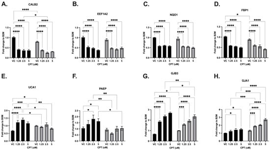 Camptothecin variably changed the SLFN12 signature cancer gene response. mRNA analysis was carried out with primer-probe RT-qPCR using increasing concentrations of CPT treatment and EV-control (black bars) or LV-SLFN12 (grey bars) for (A) CALB2 (n = 5, p < 0.0001), (B) EEF1A2 (n = 5, p < 0.0001), (C) NQO1 (n = 4, p < 0.0001), (D) FBP1 (n = 4, p < 0.0001), (E) UCA1 (n = 5, p < 0.0001), (F) PAEP (n = 5, p < 0.0001), (G) GJB3 (n = 4, p < 0.0001), and (H) GJA1 (n = 5, p < 0.0001). B2M was used as the reference gene. All error bars shown represent the standard error of the mean.