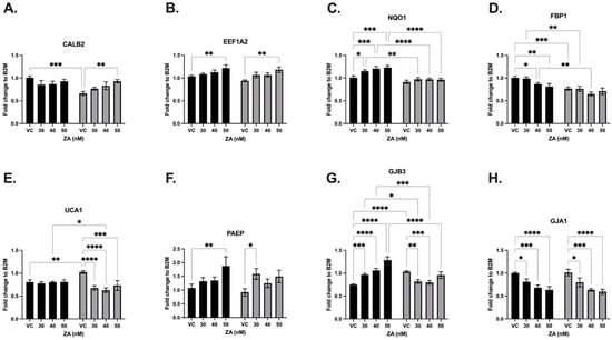 Zoledronic acid variably changed the SLFN12 signature cancer gene response. mRNA analysis was carried out with primer-probe RT-qPCR using increasing concentrations of ZA treatment and EV-control (black bars) or LV-SLFN12 (grey bars) for (A) CALB2 (n = 5, p < 0.0001), (B) EEF1A2 (n = 5, p < 0.0001), (C) NQO1 (n = 4, p < 0.0001), (D) FBP1 (n = 4, p < 0.0001), (E) UCA1 (n = 5, p < 0.0001), (F) PAEP (n = 5, p < 0.0001), (G) GJB3 (n = 4, p < 0.0001), and (H) GJA1 (n = 5, p < 0.0001). B2M was used as the reference gene. All error bars shown represent the standard error of the mean.