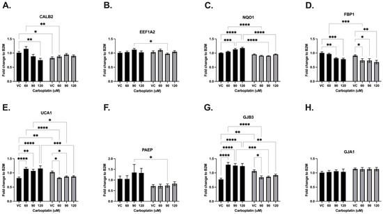 Carboplatin variably changed the SLFN12 signature cancer gene response. Increasing concentrations of carboplatin treatment were analyzed by mRNA primer-probe RT-qPCR with EV-control (black bars) or LV-SLFN12 (grey bars) for (A) CALB2 (n = 5, p < 0.0001), (B) EEF1A2 (n = 5, p < 0.0001), (C) NQO1 (n = 4, p < 0.0001), (D) FBP1 (n = 4, p < 0.0001), (E) UCA1 (n = 5, p < 0.0001), (F) PAEP (n = 5, p < 0.0001), (G) GJB3 (n = 4, p < 0.0001), and (H) GJA1 (n = 5, p < 0.0001). B2M was used as the reference gene. All error bars shown represent the standard error of the mean.