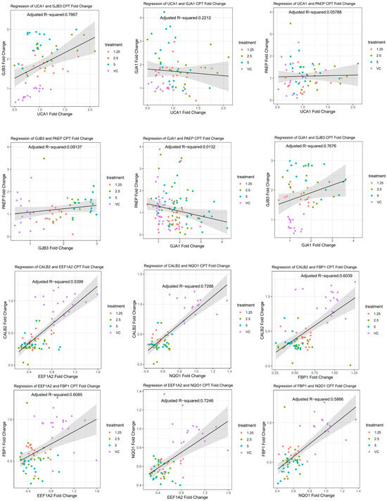 Since it appears that some of the chemotherapy agents resulted in similar up- or downregulation of the SLFN12 signature genes, we analyzed the correlations of the signature genes that changed in their mRNA expressions similarly to each other within each chemotherapy treatment (Supplementary Table S5). The R2 values display the strongest relationship correlation for the SLFN12 signature genes with the CPT treatment (Figure 9). The correlation data tables for carboplatin, ZA, and paclitaxel did not have strong R2 values (Supplementary Table S5).