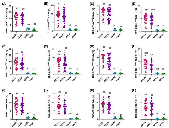 p = 0.000). A similar pattern was observed for other receptors studied, where TLR-3, TLR-4, and TLR-9 were also significantly higher in the GC group. For example, the expression of TLR-9 in CD3-CD56+ cells was, on average, 12.42 ± 9.53 in the GC group and 1.26 ± 0.87 in the HV group (