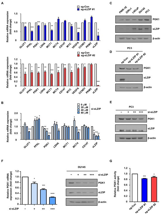 sLZIP regulates the expression of PGK1 in prostate cancer. (A) The mRNA expression level of glycolytic genes in sLZIP knockout PC3 cells (sg-sLZIP #1 and #2) was determined using qRT-PCR. β-actin was used as an internal control. (B) PC3 cells were transfected with increasing si-sLZIP (0, 20, 40, and 80 μM). mRNA levels were determined using qRT-PCR. β-actin was used as an internal control. (C) Protein expression levels were determined by western blotting using whole-cell lysates of PWR-1E, 22Rv1, LNCaP, DU145, and PC3 cells. β-actin was used as an internal control. (D) Protein levels of sLZIP knockout PC3 cells were determined by western blotting. β-actin was used as an internal control. (E) PC3 cells were transfected with increasing si-sLZIP (0, 20, 40, and 80 μM). Protein levels were determined by western blotting. β-actin was used as an internal control. (F) DU145 cells were transfected with increasing si-sLZIP (0, 25, 50, and 100 μM). mRNA and protein levels were examined using qRT-PCR and western blotting, respectively. β-actin was used as an internal control. (G) The human PGK1 enzyme activity in sLZIP knockout PC3 cells was measured through ELISA. All p-values were obtained using unpaired two-tailed Student’s t-test. * p < 0.05, ** p < 0.01, *** p < 0.001, **** p < 0.0001. Error bars: Mean ± SEM of three experiments.