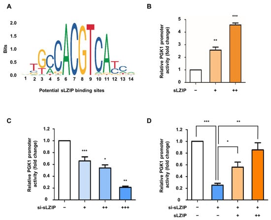 sLZIP functions as a transcriptional regulator of PGK1 in prostate cancer. (A) JASPAR enrichment analysis of potential sLZIP binding sites. (B) PC3 cells were transfected with the human PGK1 promoter, the Renilla-encoded vector, and increasing GFP-sLZIP expression plasmids (0, 0.25, and 0.5 μg). Promoter activity was measured after 24 h of transfection. (C) PC3 cells were transfected with the human PGK1 promoter, the Renilla-encoded vector, and increasing concentration of si-sLZIP (0, 20, 40, and 80 μM). Promoter activity was measured after 24 h of transfection. (D) PC3 cells were transfected with the human PGK1 promoter, the Renilla-encoded vector, si-sLZIP (80 μM), and increasing GFP-sLZIP expression plasmids (0, 0.25, and 0.5 μg). Promoter activity was measured after 24 h of transfection. All p-values were obtained using unpaired two-tailed Student’s t-test. * p < 0.05, ** p < 0.01, *** p < 0.001. Error bars: Mean ± SEM of three experiments.
