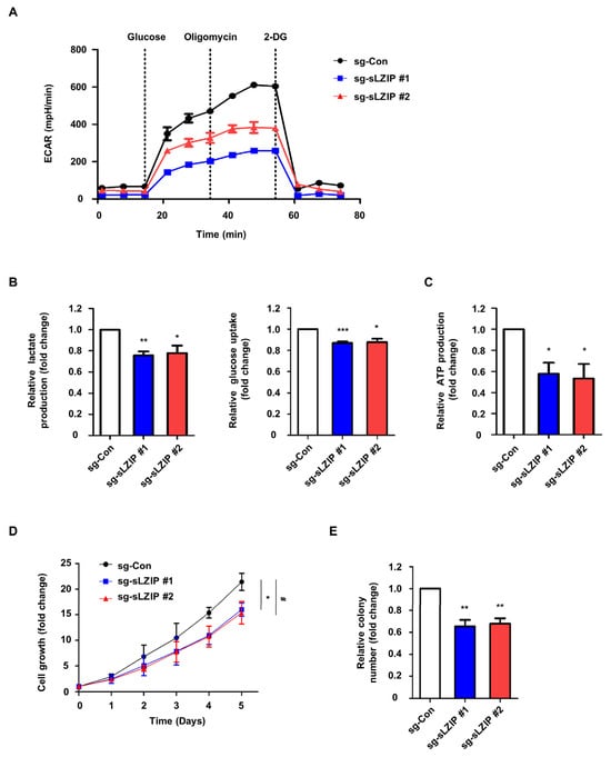 sLZIP induces metabolic reprogramming of prostate cancer cells and promotes cell proliferation. (A) The sLZIP knockout PC3 cells were seeded in XF 24-well plates and ECAR levels were measured using XF Analyzer. Raw ECAR data were normalized against the total amount of proteins. ECAR data were quantified using the Seahorse Wave software 2.6. (B) Lactate production and glucose uptake levels of sLZIP knockout PC3 cells were measured. Conditioned medium was collected from PC3 control and PC3 sLZIP knockout cells after 24 h in fresh medium. The amount of lactate present in the conditioned medium was analyzed using the lactate assay. The amount of glucose uptake was measured by subtracting the amount of glucose in the original medium and was analyzed through the glucose assay. Results were normalized with cell number and total protein level, respectively. (C) ATP production levels were measured in sLZIP knockout PC3 cells. Results were normalized with the total protein level. (D) Cell viability of sLZIP knockout PC3 cells was evaluated by MTT assay over 6 days. (* p-value; sg-sLZIP #1, # p-value; sg-sLZIP #2). (E) The colony number of sLZIP knockout PC3 cells was measured by colony formation assay over 5 days. All p-values were obtained using unpaired two-tailed Student’s t-test. * p < 0.05, ** p < 0.01, *** p < 0.001. Error bars: Mean ± SEM of three experiments.