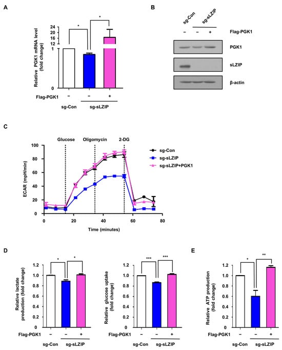 Overexpression of PGK1 in sLZIP knockout cells recovered aerobic glycolysis. (A,B) The sLZIP knockout PC3 cell (sg-sLZIP #1) was transfected with Flag-PGK1 (1.5 μg) and the following functional assays were performed. The mRNA and protein expression levels were determined through qRT-PCR and western blotting, respectively. β-actin was used as an internal control. (C) PC3 cells were seeded in XF 24-well plates and ECAR was measured using the XF Analyzer. Raw ECAR data were normalized against the total amount of proteins. ECAR data were quantified using the Seahorse Wave software 2.6. (D) Lactate production and glucose uptake levels were measured. Conditioned medium was collected after 24 h in fresh medium. The amount of lactate present in the conditioned medium was analyzed using the lactate assay. The amount of glucose uptake was measured by subtracting the amount of glucose in the original medium and was analyzed using the glucose assay. Results were normalized with cell number and total protein level, respectively. (E) ATP production levels were measured. Results were normalized with the total protein level. All p-values were obtained using unpaired two-tailed Student’s t-test. * p < 0.05, ** p < 0.01, *** p < 0.001. Error bars: Mean ± SEM of three experiments.