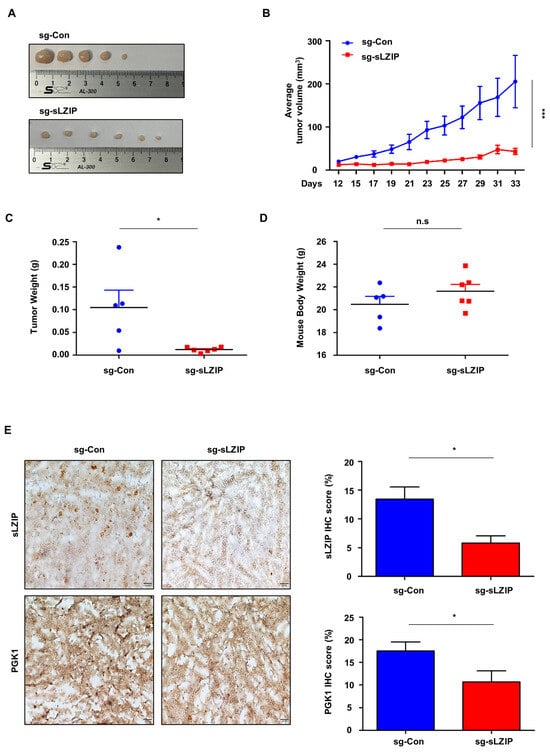 3.5. Deletion of sLZIP Inhibits Tumor Growth by Regulating PGK1 Expression in Vivo