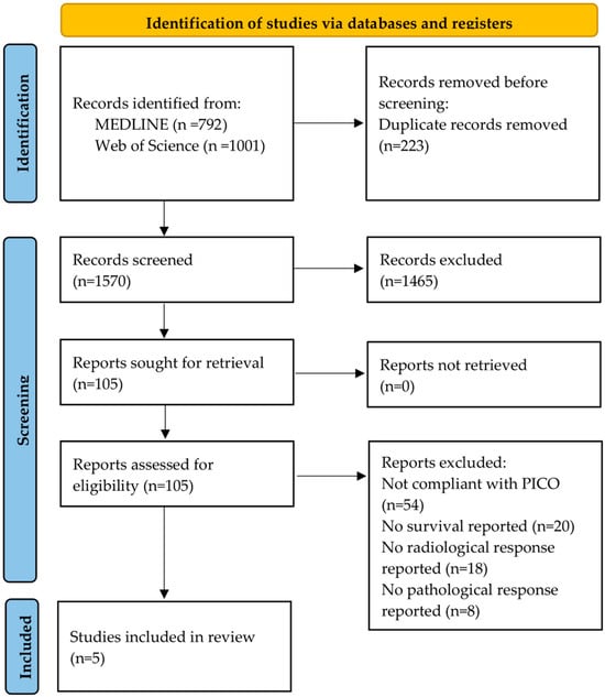 On 18/09/2024, MEDLINE via PubMed and Web of Science was searched. No relevant articles were found in the Cochrane Reviews. A total of 223 duplicates were identified by EndNote and removed. A total of 105 articles was chosen for a full-text screening. Of these, 100 reports were excluded for the following reasons: not compliant with the PICO criteria (n = 54), no survival reported (n = 20), no radiological response reported (n = 18), or no pathological response reported (n = 8). Ultimately, five studies [18,19,20,21,22] met the inclusion criteria. The study flowchart was presented in Figure 1.