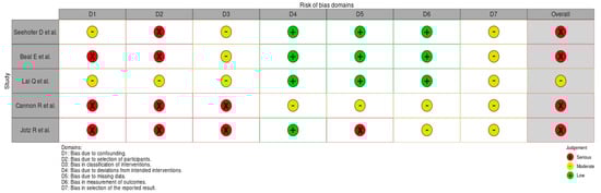 Risk of bias assessment in the included studies. ROBINS-I tools were used, and studies were classified as having low, moderate, serious, or critical risk of bias in seven domains. One study was classified to be at moderate risk of bias and four studies were classified at serious risk of bias. The overall bias was assessed as moderate if the study was judged to be at low or moderate risk of bias for all domains. The overall bias was assessed as serious risk of bias if the study was judged to be at serious risk of bias in at least one domain, but not at critical risk of bias in any domain.