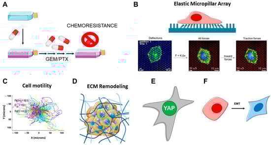 Workflow of the study. (A) PDAC cells were exposed to gemcitabine (GEM) or paclitaxel (PTX) to generate chemoresistant clones. (B) PDAC cells, and their resistant subclones, seeded on elastic micropillar arrays of varying stiffness were assessed for force generation by measuring the pillar deflections. Traction forces were defined as the inward-pointing forces. (C) Single-cell motility was assessed in cells seeded on collagen- and fibronectin-coated substrates. (D) The 3D collagen-embedded spheroid invasion and spheroid-induced ECM remodeling were analyzed. (E) YAP nuclear translocation assessed by immunofluorescence for cells growing on soft pillars. (F) Biomarkers of epithelial-to-mesenchymal transition (EMT) were assessed by RT-qPCR. Part of the figure was adapted from images made by Servier Medical Art by Servier, licensed under a Creative Commons Attribution 4.0 Unported License, at https://smart.servier.com.