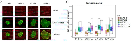 PDAC cell spreading area varies with stiffness. (A) Representative confocal microscopy images of BxPC-3 cells (green) growing on fibronectin-coated pillars (red) of different stiffness. Scale bar: 10 µm (B) Boxplots of cell spreading area (μm2) for BxPC-3, CAPAN-1, HPDE, SUIT-2.028, and SUIT-2.007 growing on fibronectin-coated pillars (25th and 75th percentiles marked, line at median).