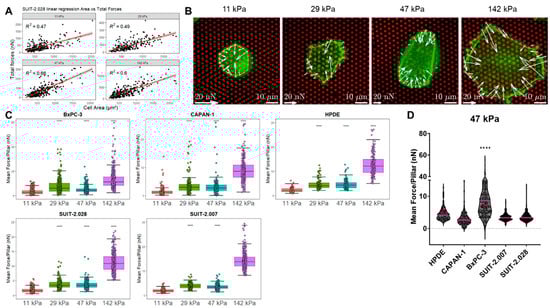 PDAC cell traction forces increase with substrate stiffness, but not with metastatic potential. (A) Representative linear regression of the total forces (nN) vs. spreading area (μm2) of SUIT-2.028. All the linear regression models of the other cell lines are found in Supplemental Figure S1. In all the measurements, the regression coefficient was R2 > 0.45. (B) Representative confocal microscopy images of the traction forces of the BxPC-3 cells (green) growing on fibronectin-coated pillars (red). White arrows indicate cellular traction forces on the pillars. (C) Boxplots of the PDAC cell traction forces expressed as mean force per pillar (nN) (25th and 75th percentiles marked, line at median). Statistical significance was calculated using the softest condition (11 kPa) as the reference group. (D) Mean force per pillar (nN) of the PDAC cell lines of different phenotypes. The results from other stiffness values (11, 29, and 142 kPa) are shown in Supplemental Figure S3 and pillar‘s background forces are shown in Supplemental Figure S2. Each dot of plots in (A,C,D) represents the result from one cell. (C,D) Statistical significance was set at p < 0.05 and is indicated by ****, p < 0.0001.