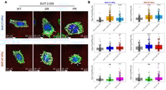 Whether PDAC cells with acquired chemoresistance have an altered mechanical characteristic has so far not been investigated. In particular, to date, no information is available for PDAC paclitaxel-resistant models. The latter is of interest for mechanobiological studies, as the drug paclitaxel affects microtubule polymerization and cytoskeleton rearrangements. We speculated that continuous exposure to paclitaxel could alter the mechanobiology of PDAC cells. Therefore, we investigated in three gemcitabine-resistant (GR) and three paclitaxel-resistant (PR) cells [19] whether force generation was affected by acquired drug resistance and the concurrent genetic changes that come with resistance. The cell line SUIT-2.028 has an epithelial-like phenotype, while PATU-T and SUIT-2.007 were representative of the mesenchymal phenotype. Given that no significant difference was observed between the intermediate stiffness values (29–47 kPa), and that the stiffest value investigated (142 kPa) had less physiological relevance for PDAC, in what follows, we proceeded to compare the soft and stiff substrates of 11 and 47 kPa only. We first confirmed, as for the non-resistant cells, that PDAC chemoresistant cells had variable cell spreading area, and that the mean force per pillar was a faithful measure of traction forces (see Supplemental Table S4 and Supplemental Figure S4).