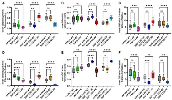 The velocity of chemoresistant PDAC cells was, in general, different from their parental clones (Figure 5A,D). The GR-resistant cells were characterized by a slight reduction in their velocity on both substrates. Paclitaxel resistance resulted in a more pronounced, yet also clear cell-specific response. For PATU-T and SUIT-2.028 PR cells, the velocity almost halved compared to the parental cells (WT) on both substrates. Conversely, for SUIT-2.007 PR, the velocity almost doubled, consistent for both substrates. It appeared that velocity, which characterizes the active and directed part of cell motility, is clearly, yet differentially, altered in chemoresistant cells.