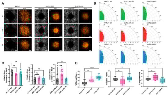 Physiologically, tumor cells move in the three-dimensional tumor microenvironment (TME). In the TME, cells come into contact with extracellular matrix proteins (collagen, hyaluronic acid, laminin, fibronectin, and others), and with other types of cells (fibroblasts, immune cells, and others). Here, we mimicked this complex in vivo situation by spheroids of each cell line which were micro-injected in type-1 collagen hydrogels to study the behavior of PDAC cells in a three-dimensional (3D) context resembling the TME. 24 h after injection, collagen fibers alignment was measured as the resemblance of cellular force generation with confocal reflection microscopy. After 48 h, 3D cell migration was measured as the ratio between the area of the spheroid in z-projection between day 2 and day 0 (Figure 6A). Resistant cell motility in 3D did not significantly differ from their parental clones, with the exception of SUIT-2.028 GR. Specifically, for the SUIT-2.028 GR cells, the relative spheroid area was significantly larger compared to SUIT-2.028 WT (2.5 ± 0.9 vs. 1.5 ± 0.9) (Figure 6C and Supplemental Table S6).