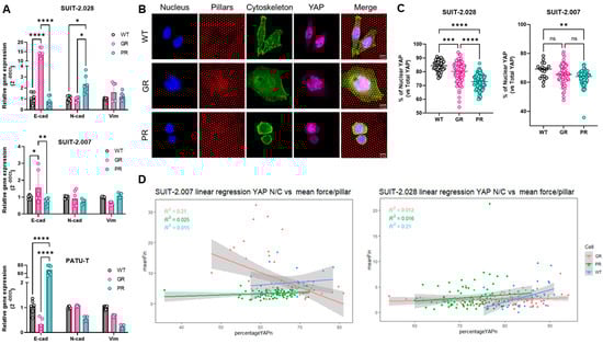To characterize mechano-response in chemoresistant cells, we checked whether differences in traction forces and migration patterns were paralleled by epithelial-to-mesenchymal transition (EMT), and the occurrence of nuclear yes-associated protein (YAP) translocation. EMT is the classical de-differentiation process epithelial cancer cells undergo, resulting in a more aggressive and invasive phenotype. EMT is characterized by a change in the expression of specific genetic markers among which is a reduced expression of E-cadherin (E-cad), and an increase in N-cadherin (N-cad) and Vimentin (Vim) expression. Interestingly, when comparing the expression of the abovementioned markers in GR and PR clones vs. parental cells (WT), a cell line-dependent effect was observed. PATU-T PR displayed an epithelial switch, with the reduced expression of both N-cad and Vim, and a 60-fold increase in E-cad expression (Figure 7A). Similarly, SUIT-2.007 GR showed a decreased expression of Vim, and a trend towards increased E-cad (Figure 7A). However, SUIT-2.028 GR showed a 15-fold increase in E-cad expression, while SUIT-2.028 PR an increase in N-cad (Figure 7A). Collectively, no consistent pattern was observed for the EMT switch among different cell lines, which could explain the increased force generation measured for chemoresistant cells.