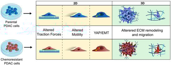 PDAC resistance leads to changes in the mechanobiological signatures of cells, the detailed characteristics of which yet depend on cell type and ECM dimensionality. Part of the figure was adapted from images made by Servier Medical Art by Servier, licensed under a Creative Commons Attribution 4.0 Unported License, at https://smart.servier.com.