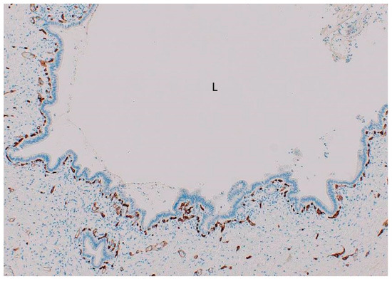 Dotted capillaries are located just beneath of the lining biliary epithelia (peribiliary capillary plexus [PCP]) in non-neoplastic intrahepatic large bile duct. L, bile duct lumen. CD34 immunostaining.