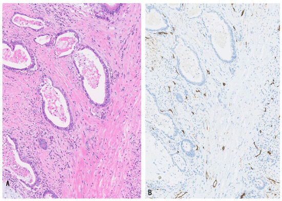 Foci of atypical neoplastic glands presenting tubular, cord-like, or micropapillary structure discontinuous with neoplastic epithelia of intramucosal or intraluminal preinvasive neoplasms, and not surrounded by dotted capillaries, were found in the walls of the biliary tract associated with high-grade BilIN, IPNB, and ICPN. They were variably differentiated and were not infrequently associated with desmoplastic reaction [5,11,12]. These glands are considered invasive carcinomas. They were embedded in fibrous stroma, in which small numbers of arteries, veins, and capillaries were found and were not oriented to these neoplastic glands (Figure 2A,B). These vessels are regarded as newly formed blood vessels (neo-angiogenesis) in fibrous stroma [5,11,12].