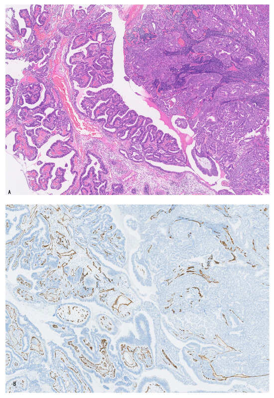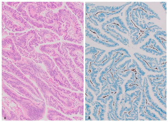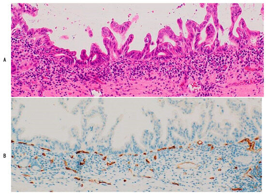 About half of IPNB, one-third of ICPNs, and all cases of PGA presented this distribution pattern. Dotted capillaries were regularly and/or rather densely found in all (or almost all) fine stalks or narrow stroma of intraluminal neoplastic components, and these capillaries underlined the neoplastic epithelial layer [11,12] (Figure 4A,B). These neoplastic epithelia and underlying capillaries were continuous with neoplastic epithelia and underlying capillaries in the stalk and stroma of intraluminal neoplasms, respectively. The intraluminal neoplastic component of this capillary pattern showed histological features of type 1 IPNB and ICPN (Table 3) [11,12].