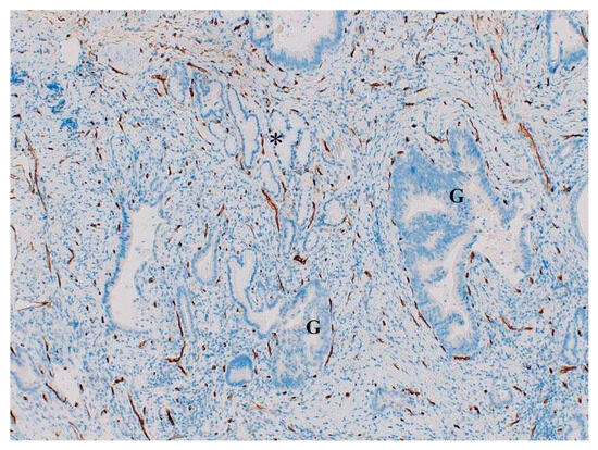 Atypical glands (G) surrounded by C34-positive dotted capillaries are located near the non-neoplastic peribiliary glands (*) of the cancerous bile duct of extrahepatic cholangiocarcinoma. CD34 immunostaining.