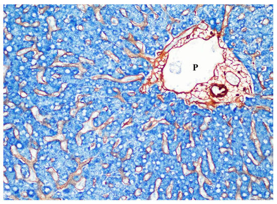 Hepatocytes (blue) arranged in cords are lined by sinusoidal cells (brown) forming hepatocyte–sinusoidal alignment. P, portal vein. Normal liver. Double immunostaining of HepParI (blue) and collagen type IV (brown).