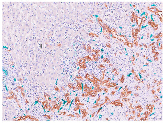 Carcinoma cells (brown) are in direct contact with non-neoplastic hepatocytes (hematoxylin-colored), presenting the replacement of hepatocytes by carcinoma cells. These carcinoma cells are surrounded by blue-colored sinusoidal cells (capillarized sinusoidal cells), suggesting vessel co-option. Sinusoidal cells that are not capillarized in the hepatic lobules are not stained with CD34. Replacement growth of cholangiocellular carcinoma. H, non-neoplastic hepatocyte. Hematoxylin and double immunostaining of CD34 (blue) and CK19 (brown).