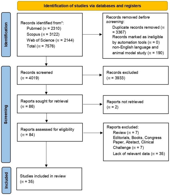 A total of 7576 titles were collected from our literature search. After the removal of duplicates and the exclusion of 3933 records due to the degrees of coherence with the inclusion/exclusion criteria, 84 articles relevant to the topic were examined. No records were unavailable for retrieval. Finally, 35 articles were included in the review. A detailed flowchart of the search process is shown in Figure 1.