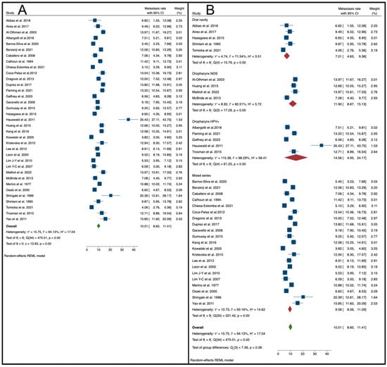 A subgroup analysis, performed by primary tumor site, showed that studies based on HPV-positive oropharyngeal cancers had a higher pooled metastasis rate (14.56%; 95% C.I.: 4.95–24.17%; I2: 98.29%, p < 0.01). The lowest rate was observed in series of oral cavity carcinomas (7.01%; 95% C.I.: 4.60–9.38%; I2: 71.54%, p < 0.01). Intermediate rate values were observed in series of HNSCCs from mixed and not otherwise classified sites (9.58%; 95% C.I.: 8.06–11.09%; I2: 93.16%, p < 0.01), and in series from oropharynx tissue with an unspecified HPV status (11.90%; 95% C.I.: 8.67–15.13%; I2: 82.51%, p < 0.01). Details are given in Figure 3. In addition, considering the oral cavity subgroup as a reference, the meta regression by primary tumor site confirmed a significantly increased risk of metastasis in studies dealing with HPV-positive oropharyngeal carcinomas (coefficient: 5.54; 95% CI: 0.16 to 10.92; p = 0.044; information is also given in Table 4).
