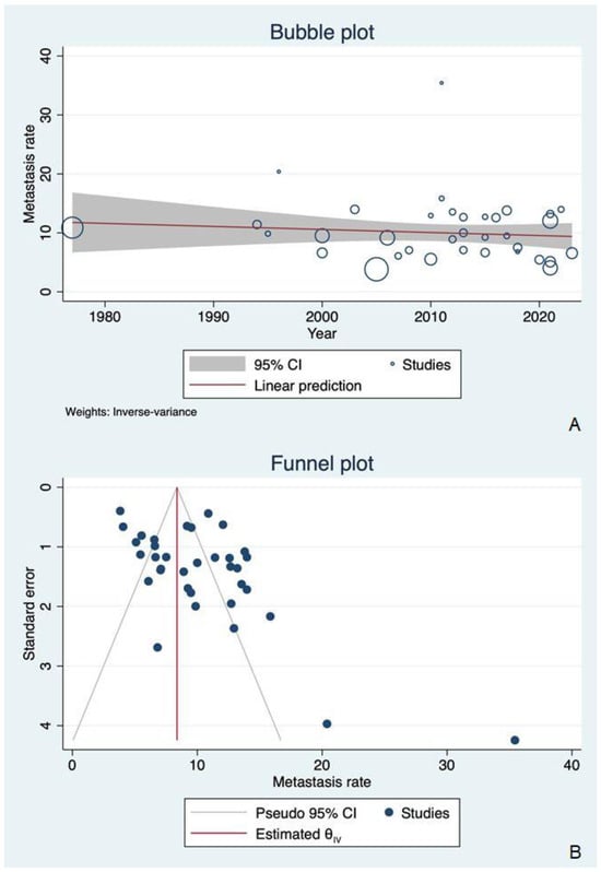 (A) A bubble plot summarizing the distribution of DM rates by publication year: no significant change in DM rate over time was visible in the included articles (coefficient = −0.0514, R2 = 0.00, p = 0.484). (B) A funnel plot showing a slightly asymmetrical distribution of DM rates, suggesting a possible publication bias. This could reasonably be due to the small study effect.