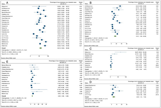 Considering the distribution of DM sites, the pooled analysis identified lung as the organ most frequently involved, accounting for the 58.16% of metastatic cases (95% C.I.: 49.63–66.69%). Bone was the second most frequently involved site, being affected in 15.31% of cases (95% C.I.: 9.92–20.69), while brain, skin, and liver hosted distant metastases in around 4% of metastatic cases (4.60%, 95% C.I.: 2.33–6.87; 4.29%, 95% C.I.: 1.13–7.45; and 4.05%, 95% C.I.: 2.62–5.48, respectively; this is also shown in Figure 4).