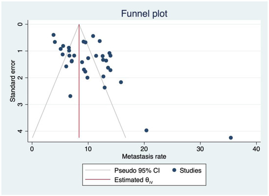 Considering the 35 studies that provided enough clinical data, the overall pooled metastasis rate was 10.01% (95% C.I.: 8.60–11.41%, as also shown in Figure 2), even if large and significant heterogeneity values were found (I2: 94.13%, p < 0.01).